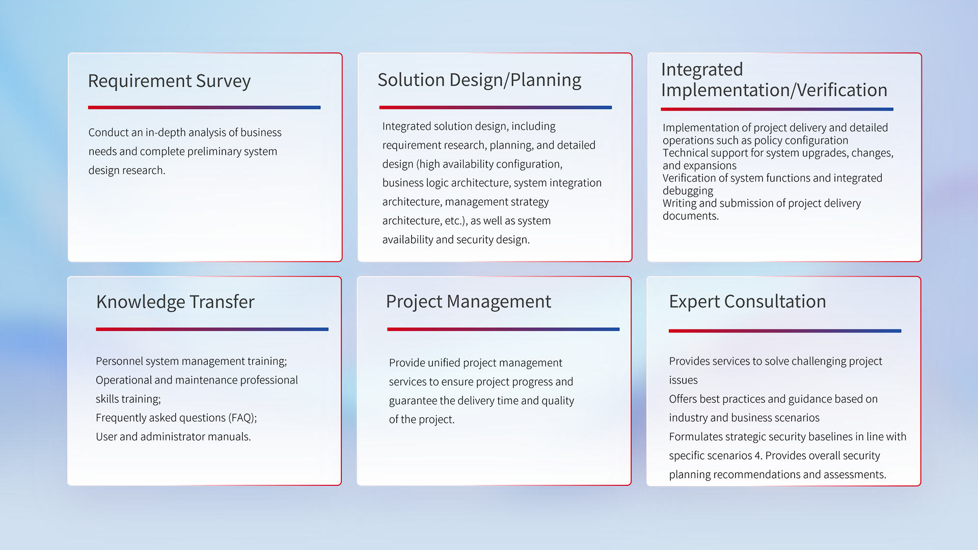 Provide tailored one-stop security management services based on customer industry characteristics, helping customers fully detect and understand cybersecurity threats. Achieve comprehensive risk management with both online and offline protection support from security experts, making security a routine process and establishing a regular security operation and maintenance service for customers.