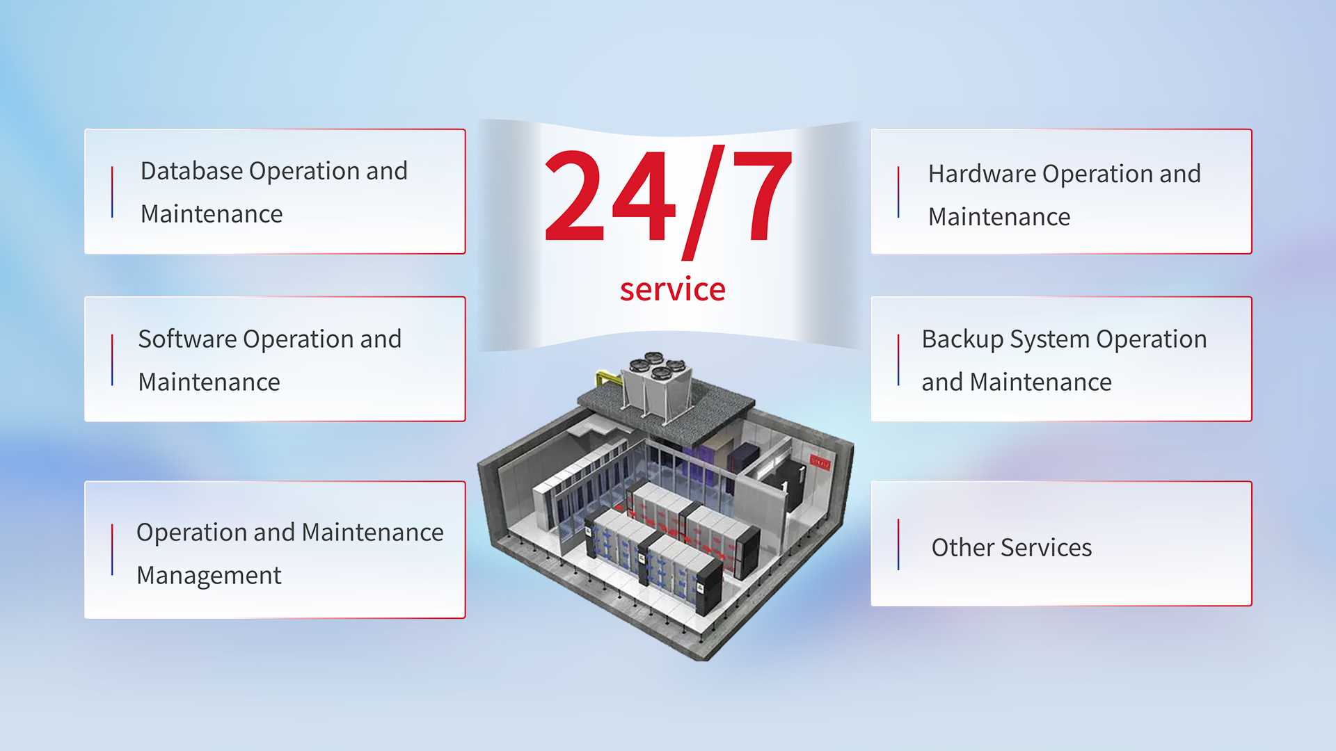 With our vision of customer business at the center and the safe and reliable operation of business systems as the goal, we provide daily maintenance of the customer's data center room's hardware and software equipment, and check the rationality of the maintenance strategies related to the design of the hardware and software systems. Ensure the customer's business systems are stable, secure, highly available, and enhance flexibility, scalability, and resource utilization.